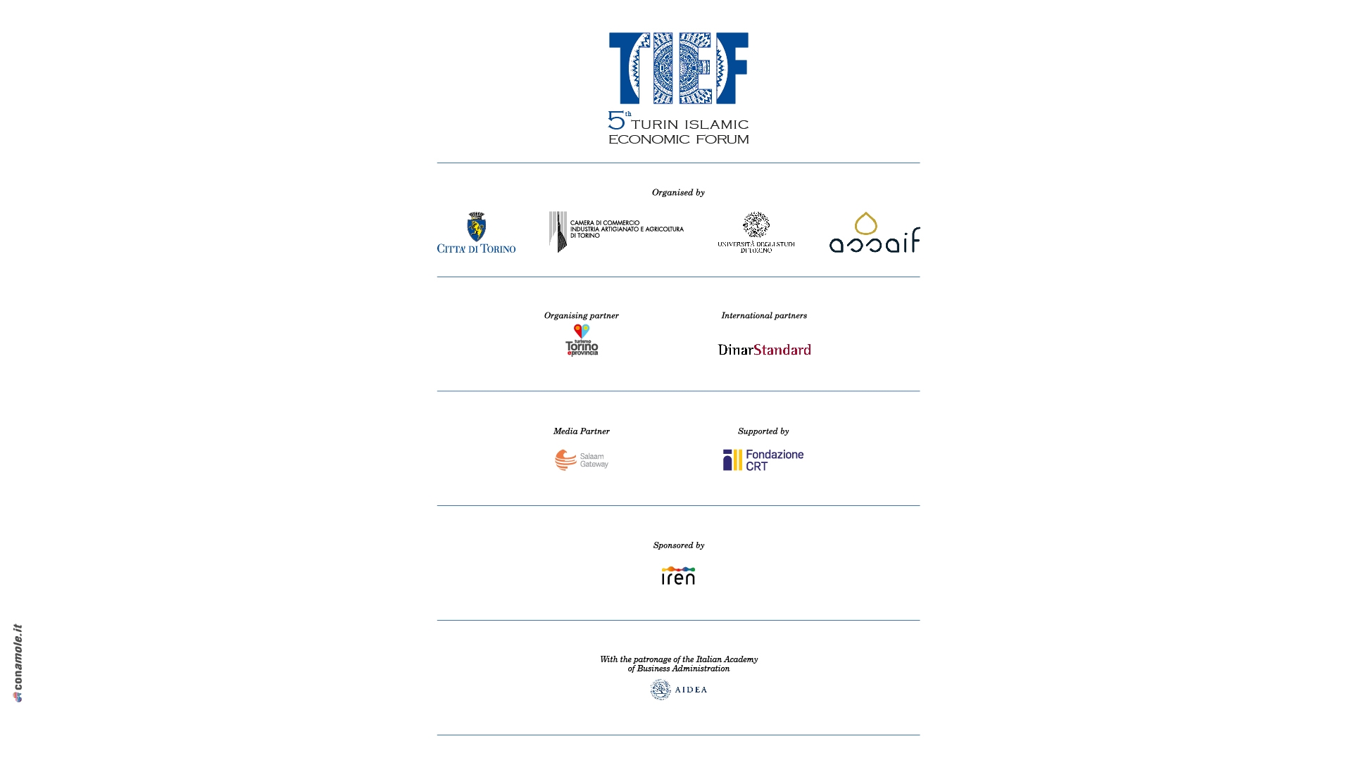 La Città di Torino, insieme agli altri partner istituzionali, attraverso il TIEF testimonia il vivo interesse per la finanza islamica, quale strumento utile per favorire l’integrazione e l’attrazione di investimenti sul territorio da parte di quei Paesi in cui la finanza islamica gioca un ruolo decisivo per lo sviluppo economico e occupazionale.